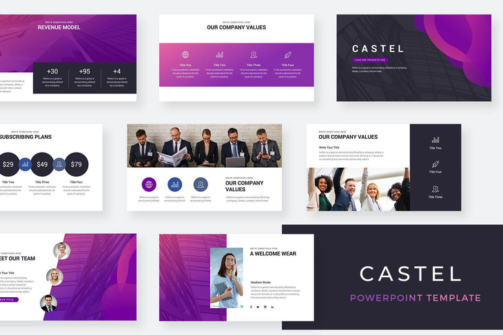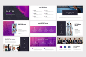 Showcase your latest business strategy with this stylish and colorful Castel PowerPoint Template. This template will help you explain the newest strategy that will take your business to the next level. With easy to use and fully customizable slides, this PowerPoint compatible template will help you create a credible and successful business presentation in no time.