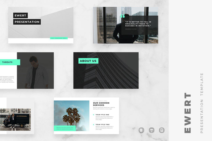 Sometimes less is more. That holds true to this Ewert Presentation Template that is composed of minimal design and the perfect amount of color. Use this stylish template to introduce your newest and latest business strategy that will improve the composition of your company. This template also contains section cover slides that allow you to introduce all of your business-related topics with ease and minimal effort.