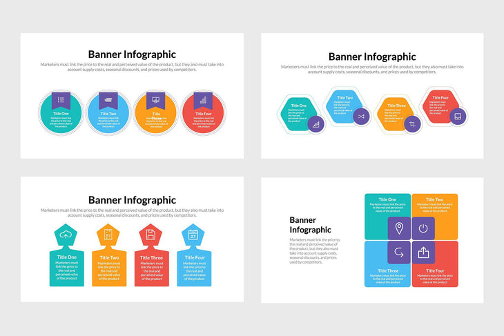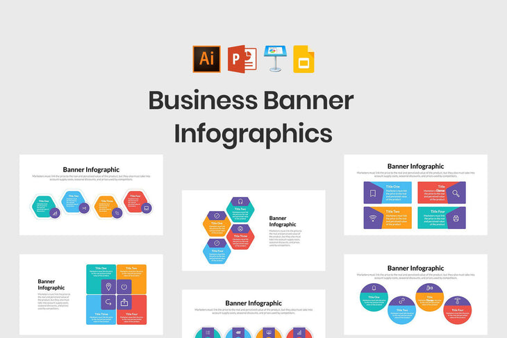 Business Banner Infographics is a colorful yet professional collection of banners that will help you organize your information in time and without putting much effort into it. This is due to the easy-to-use setup this theme was built with that is going to shorten your time working with it. Its design is going to be perfect if you are looking to compare different products, present your best sellers, show important factors that are affecting your company, and much more. Only copy the information and statistics you need to present and past them into the banner that you like the best. Also, make it match with your company’s colors and image by changing the colors and sizes.